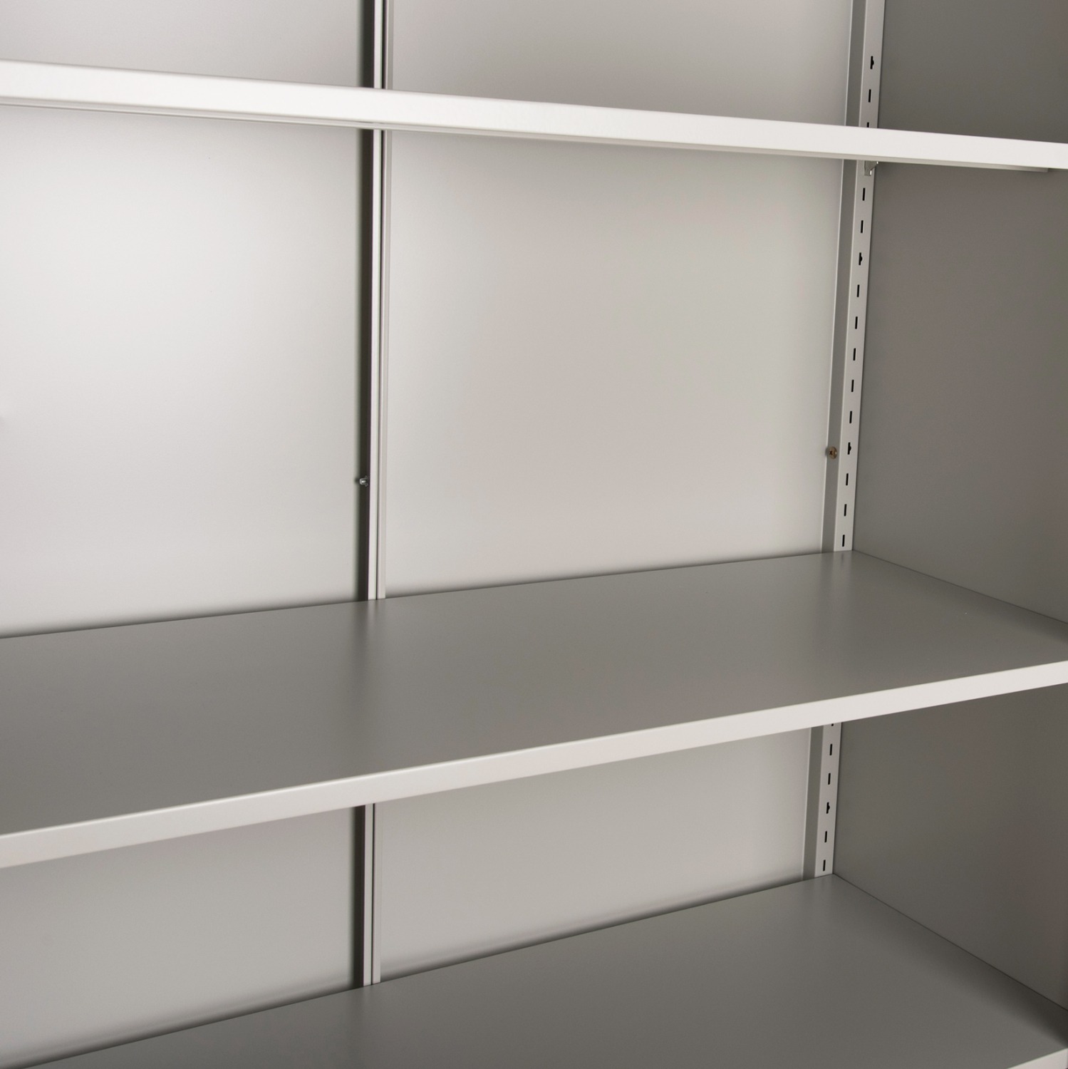 Είναι μια πρακτικότατη μεταλλική ντουλάπα με πόδια που έχει φτιαχτεί με γνώμονα την χωρητικότητα και την ανθεκτικότητα. Είναι δίφυλλη με τις δύο πόρτες να κλείνουν ακριβώς στην μέση της κατασκευής, ενώ το εσωτερικό είναι ένας ενιαίος χώρος χωρίς κάθετα χωρίσματα. Διαθέτει μια μεταλλική ΙΝΟΧ μπάρα στο επάνω μέρος για κρέμασμα, και 4 ράφια που δημιουργούν 5 αποθηκευτικούς χώρους. Οι πόρτες διαθέτουν κλειδαριά που κλειδώνει με κλειδί, ενώ το χρώμα της ντουλάπας είναι πολύ ανοιχτό γκρι.